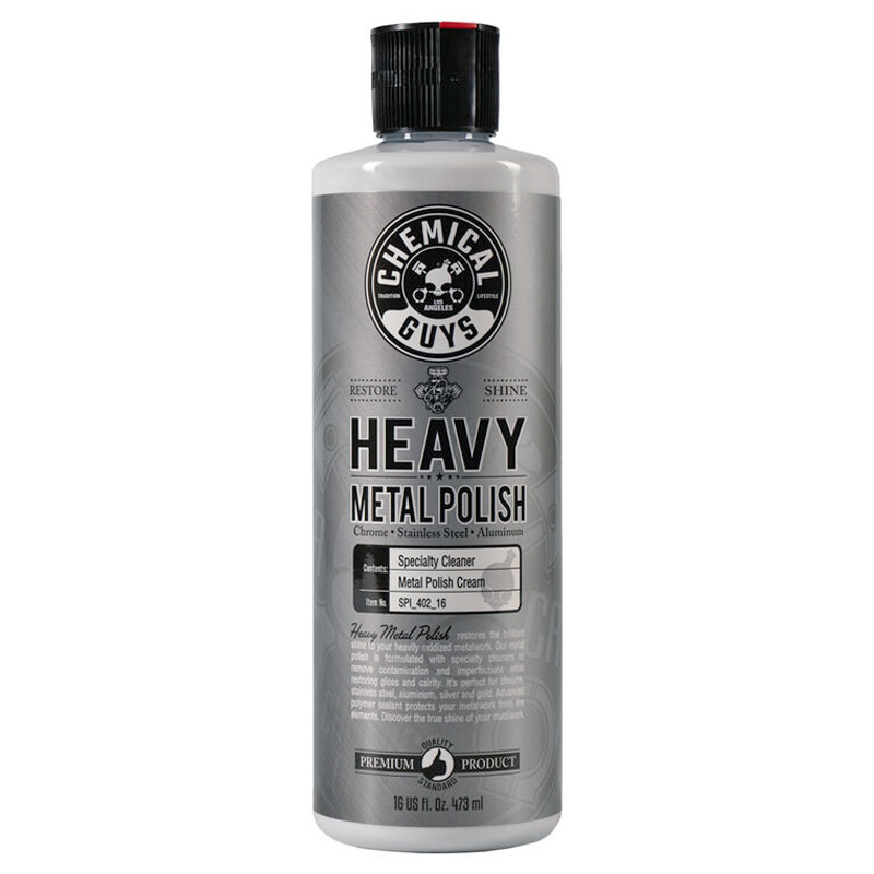 When polished metals are left in the open, oxygen and sulphur reacts with the surface of the metal. This tarnish affects the outermost layer of the metal with a chemical reaction that dulls its shine. Heavy Metal Polish is formulated with specialty metal cleaners and micro-abrasives that break down and release oxides, tarnish, and contamination to restore gloss and clarity to bare polished metal.